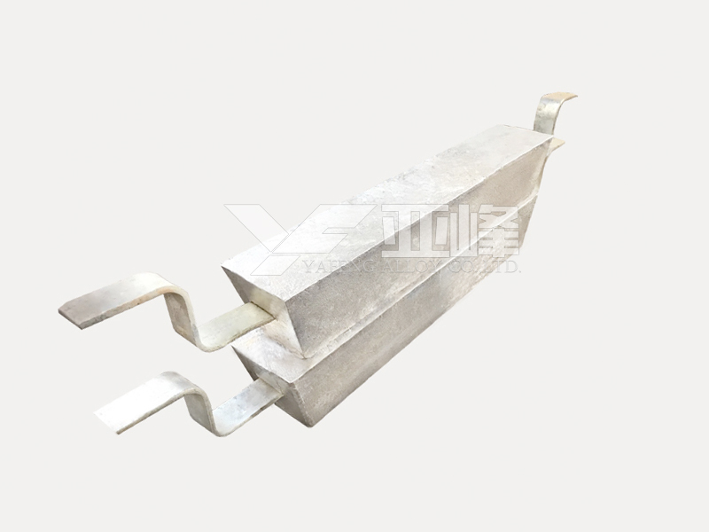 常用的鋁合金陽極有Al-Zn-In系和Al-Zn-Hg系陽極,適用于海水中的船舶、碼頭港口與海洋設(shè)施、海水冷卻水系統(tǒng)和儲罐沉積水部位等構(gòu)筑物的陰極保護。鋁鋅銦系(AZI系)犧牲陽極是用高純度鋁及鋅、銦等金屬合金化而鑄成的。鋁合金陽極生產(chǎn)執(zhí)行GB/T4948-2002《鋁-鋅-銦系合金犧牲陽極》。
